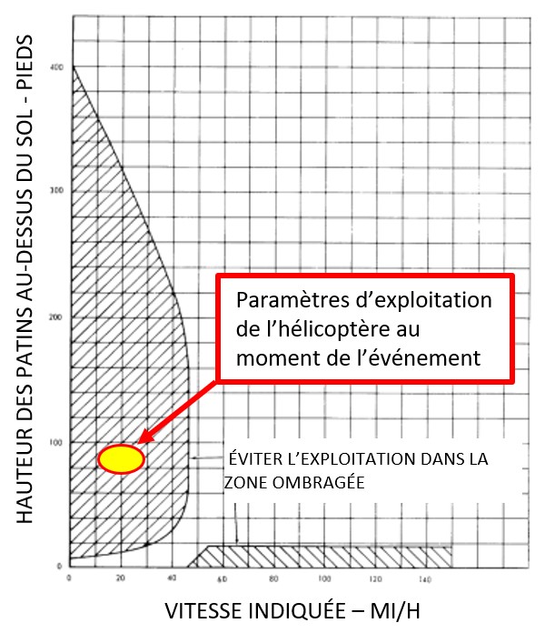 Le manuel de vol du giravion Bell 206BNote de bas de page 3 comprend un diagramme hauteur/vitesse (figure 3), qui présente des renseignements et des conseils aux pilotes sur l’utilisation sécuritaire de l’hélicoptère. Le diagramme hauteur/vitesse définit les conditions dans lesquelles un atterrissage sécuritaire peut être effectué après une panne de moteur en vol (urgence). Une note figurant sur le diagramme encourage les pilotes à éviter l’exploitation dans la zone ombragée.