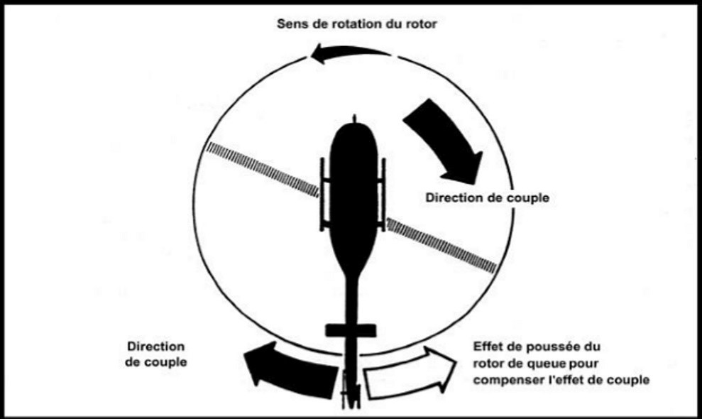 Pour contrer ce mouvement, l’hélicoptère est muni d’un rotor de queue qui produit une poussée latérale. Pour compenser le couple créé par le rotor principal pendant de nombreux régimes de vol normaux, le pilote exerce une pression sur les pédales du palonnier pour augmenter ou réduire la poussée du rotor de queue, au besoin.