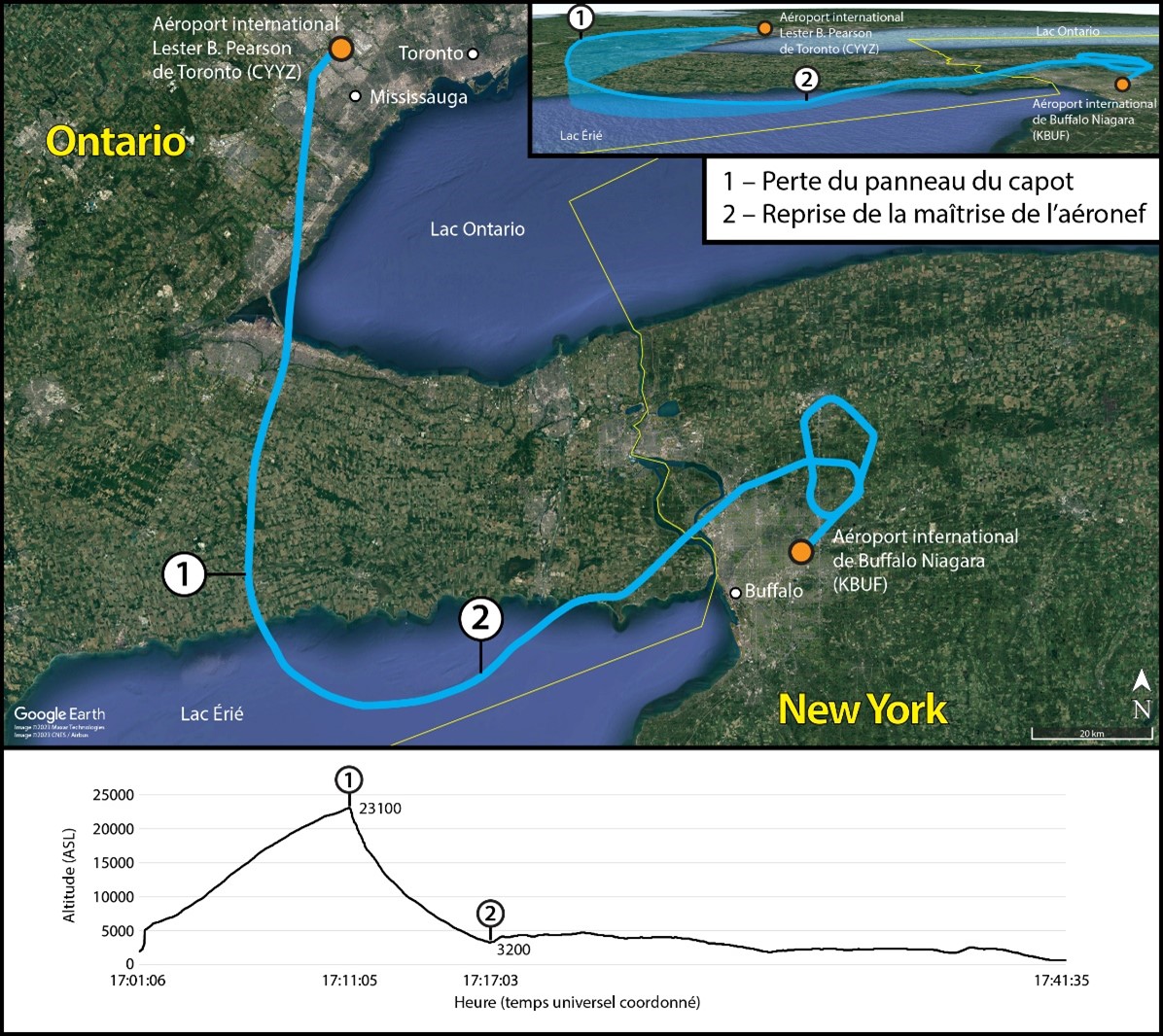 Vers 12 h 11, alors que l’aéronef était en montée au-dessus de Cayuga (Ontario) (emplacement approximatif), à une altitude d’environ 23 000 pieds au-dessus du niveau de la mer (ASL), tout le panneau supérieur du capot et la majeure partie du panneau inférieur du capot du moteur gauche se sont partiellement détachés de la nacelle, avant de se détacher complètement, ce qui a entraîné une augmentation soudaine de la traînée parasite sur le côté gauche de l’aéronef. L’aéronef a fait un brusque mouvement de lacet et de roulis vers la gauche, et il y a eu perte de maîtrise de l’aéronef alors que ce dernier perdait rapidement de l’altitude. L’équipage de conduite a par la suite déclaré une situation d’urgence en transmettant un appel Mayday, et à environ 3200 pieds ASL, il a repris la maîtrise de l’aéronef et a interrompu la descente (figure 1).
