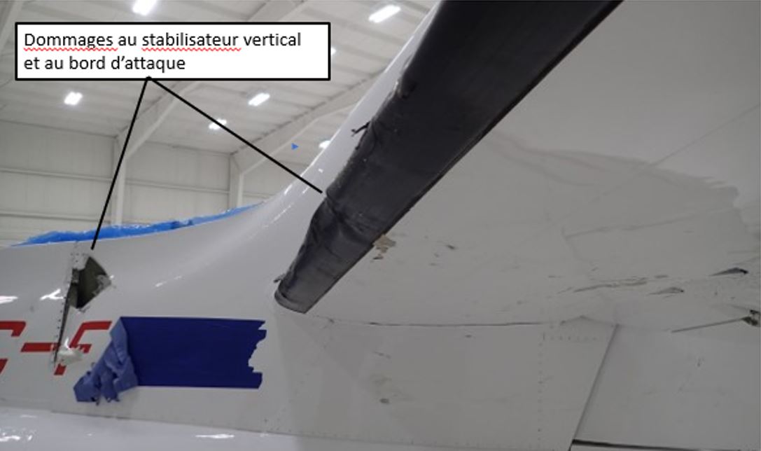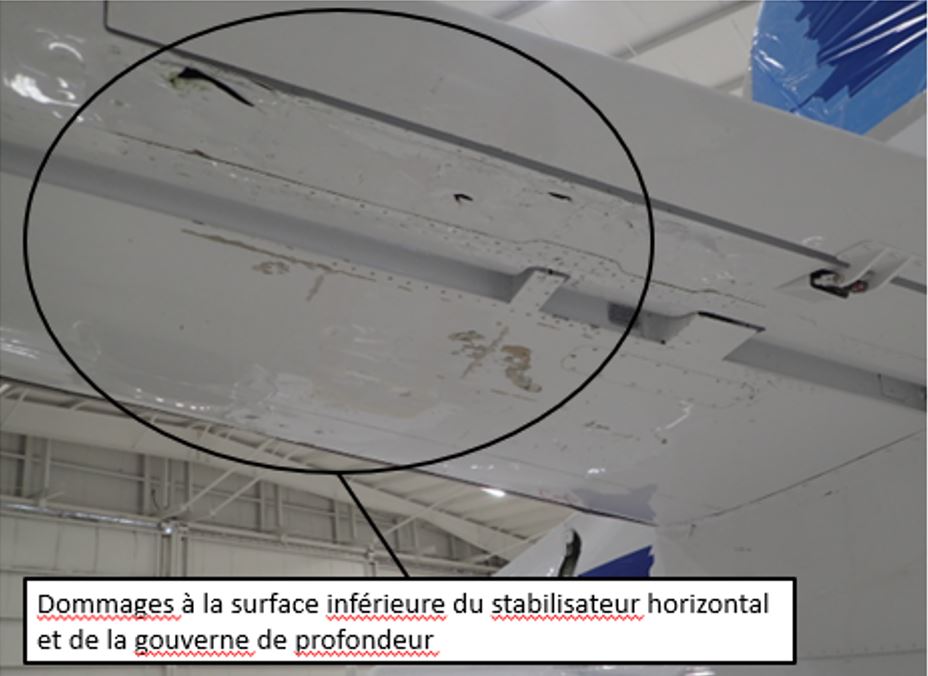 Sur le stabilisateur horizontal gauche, le bord d’attaque était bosselé, et le boudin de dégivrage avait été coupé à plusieurs endroits. Ses surfaces supérieure et inférieure, ainsi que celles de la gouverne de profondeur, étaient également bosselées et perforées à différents endroits (figure 4).