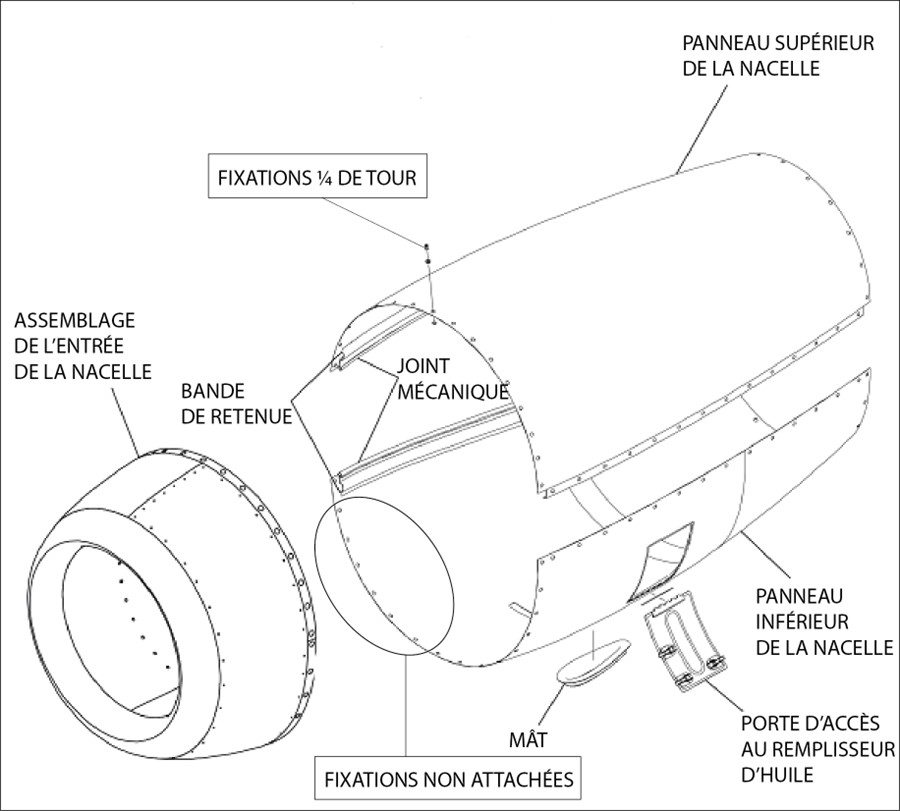 À la suite d’une inspection des points de fixation des panneaux supérieur et inférieur du capot sur la nacelle du moteur gauche, on a remarqué que plusieurs fixations ¼ de tour étaient encore engagées dans leurs réceptacles. Des marques et de minuscules particules restantes des panneaux du capot entouraient les œillets des fixations, probablement parce que les panneaux du capot se sont déchirés autour des fixations avant de se détacher de la nacelle du moteur.