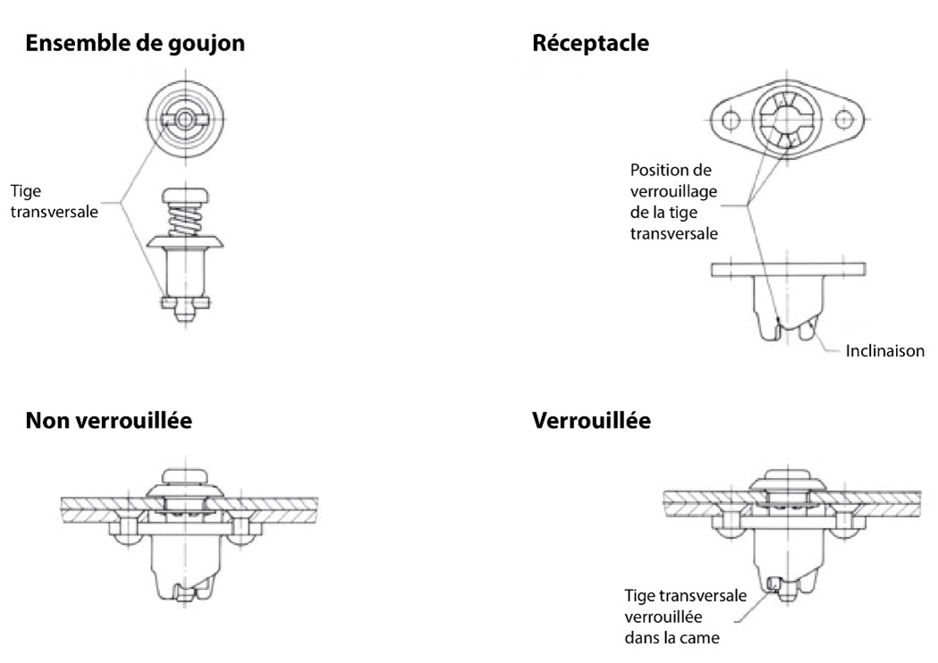 Les fixations ¼ de tour de l’aéronef à l’étude ont été fabriquées par Camloc Motion Control Ltd. et se composent d’un goujon, d’un anneau de retenue et d’un réceptacle à came (également appelée une came). Lorsqu’un ensemble de goujon sur un panneau du capot est poussé dans une came sur la nacelle et tourné, la tige transversale du goujon descend le long de la came, tirant les 2 surfaces ensemble et comprimant le ressort intégré. Cette action est accomplie en faisant tourner le goujon de 90° (ou ¼ de tour). Une fois le goujon tourné, la tige transversale s’insère dans le cran de verrouillage, qui maintient le goujon en place (figure 6) Note de bas de page 19. Pour libérer la fixation, le goujon doit être poussé plus loin dans le réceptacle, de manière à le dégager du cran de verrouillage, puis il doit être tourné ¼ de tour dans la direction opposée Note de bas de page 20 . Lorsque la tige transversale du goujon n’est pas engagée dans la came, le ressort est allongé et garde la tête du goujon au-dessus de la surface du panneau de l’aéronef, exposée au débit d’air.