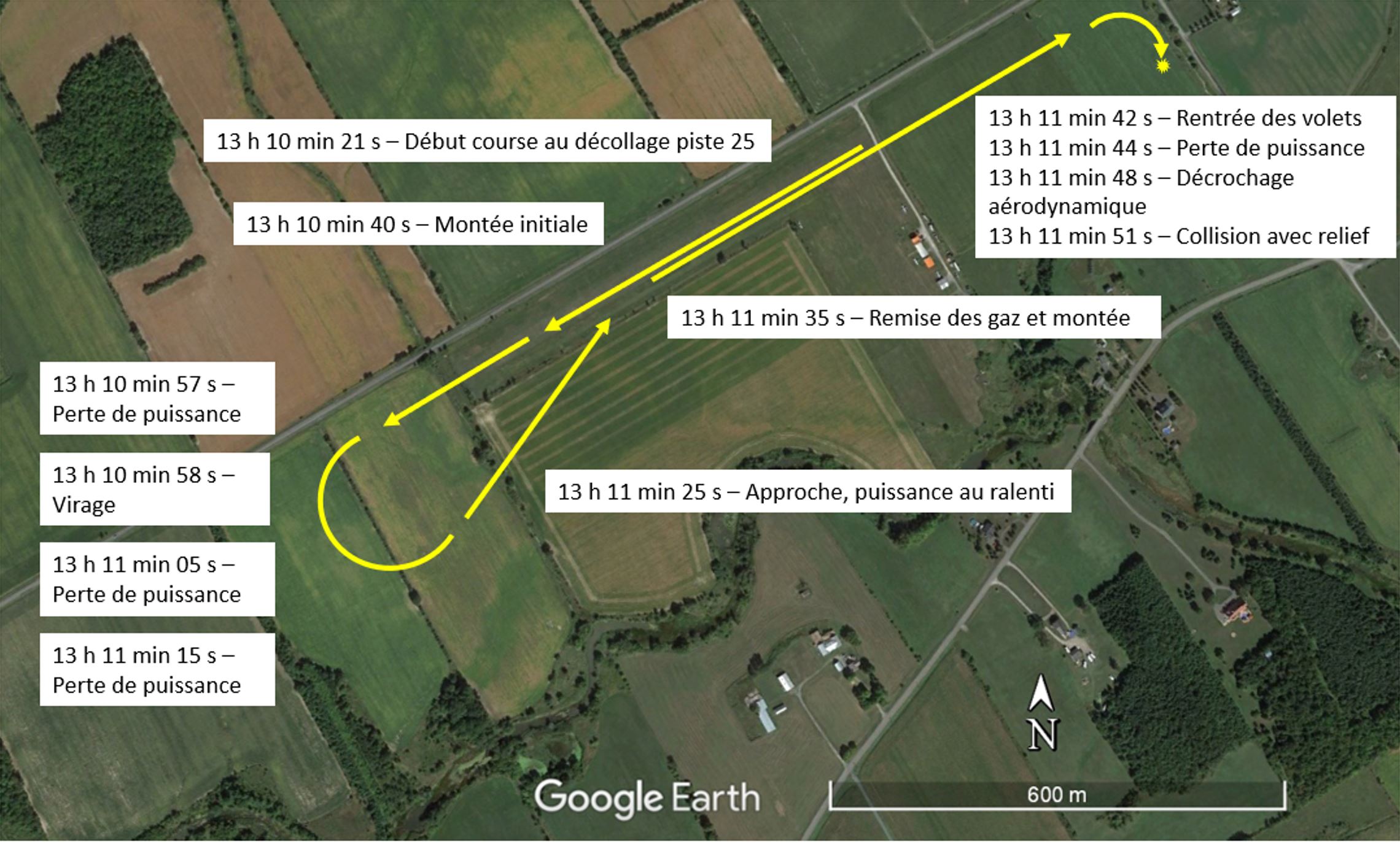 À 12 h 55, l’aéronef est arrivé à CNS4, a effectué 2 circuits et s’est posé sur la piste 25. Il a ensuite été repositionné pour le décollage au seuil de la piste 25. À 13 h 10 min 57 s, peu après le décollage et lorsque l’aéronef se trouvait à moins de 200 pieds au-dessus du sol (AGL), le moteur a subi une perte partielle de puissance momentanée. Le pilote instructeur, qui était assis dans le siège de droite, a pris les commandes de l’aéronef et a effectué un virage à gauche de 180° à basse altitude pour effectuer une approche vers la piste 07. Pendant le virage, l’aéronef a subi 2 autres pertes partielles de puissance (à 13 h 11 min 05 s et à 13 h 11 min 15 s). L’aéronef s’est fortement incliné avant de se réaligner au-dessus de la piste, à peu près à mi-piste. À 13 h 11 min 35 s, alors qu’il restait moins de 1000 pieds de piste et avant que l’aéronef ne se pose, le pilote instructeur a amorcé une remise des gaz.
