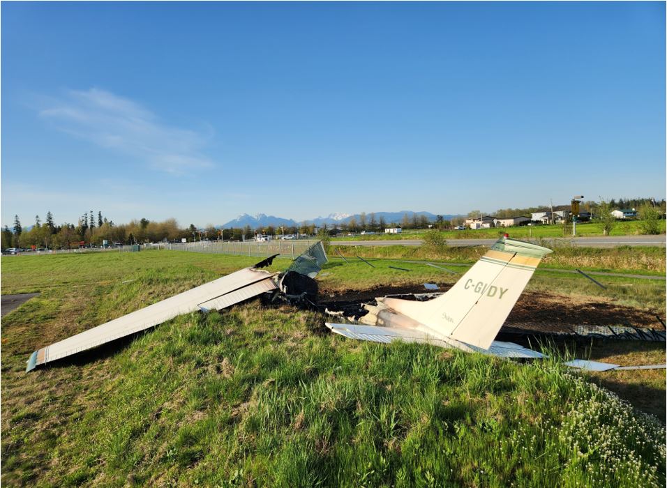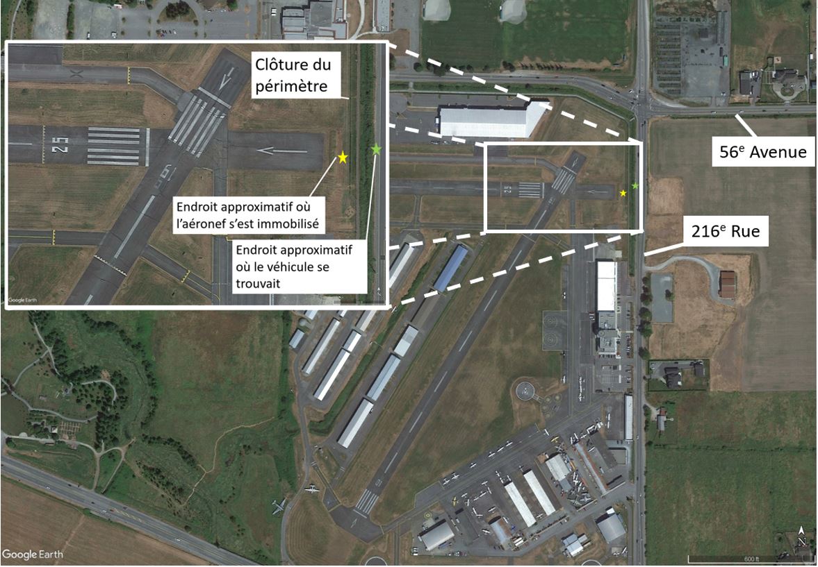 Le 2 mai 2023, l’aéronef Cessna 182P sous immatriculation privée (immatriculation C-GIDY, numéro de série 18261845) effectuait un vol de tourisme selon les règles de vol à vue à partir de l’aéroport régional de Langley (CYNJ) (Colombie-Britannique) avec le pilote et 1 passagère à bord. De retour à CYNJ, le pilote a effectué une approche directe vers la piste 25. Vers 15 h 02Note de bas de page 1, l’aéronef a été observé bas pendant l’approche. Peu après, l’aéronef a heurté une camionnette qui circulait sur la 216e Rue, une route publique située à environ 450 pieds à l’est du seuil décalé de la piste. Il a ensuite heurté la clôture du périmètre de l’aéroport à environ 60 pieds à l’ouest de l’impact initial avec la camionnette, puis a continué à glisser avant de s’immobiliser contre un monticule 30 pieds plus loin (figure 1). Un incendie s’est déclaré peu après. La passagère a pu sortir de l’aéronef seule, et un passant a aidé le pilote à sortir de l’aéronef. Le pilote a été grièvement blessé et la passagère a subi des blessures mineures; tous deux ont été transportés par la voie des airs à l’hôpital. Le conducteur de la camionnette a subi des blessures mineures et a été transporté à l’hôpital par ambulance terrestre. Les pompiers ont éteint l’incendie de l’aéronef et le feu de broussailles autour. L’aéronef a été détruit.
