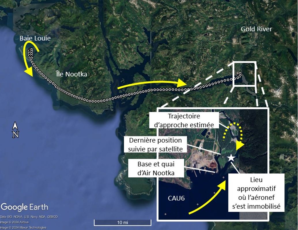Les stations d’observation météorologique pour l’aviation les plus proches sont situées à l’aéroport de Campbell River (CYBL) (Colombie-Britannique), à 38 milles marins (NM) au nord-est de CAU6; à l’aéroport de Tofino/Long Beach (CYAZ) (Colombie-Britannique), à 32 NM au sud-sud-est; à l’aéroport de Comox (CYQQ) (Colombie-Britannique), à 48 NM à l’est; et à l’aéroport de Nanaimo (CYCD) (Colombie-Britannique), à 92 NM à l’est-sud-est. Les messages d’observation météorologique régulière pour l’aviation (METAR) valides à 17 h le 28 juillet 2023 (environ 20 minutes avant l’événement) indiquaient des conditions favorables au vol et à l’atterrissage.