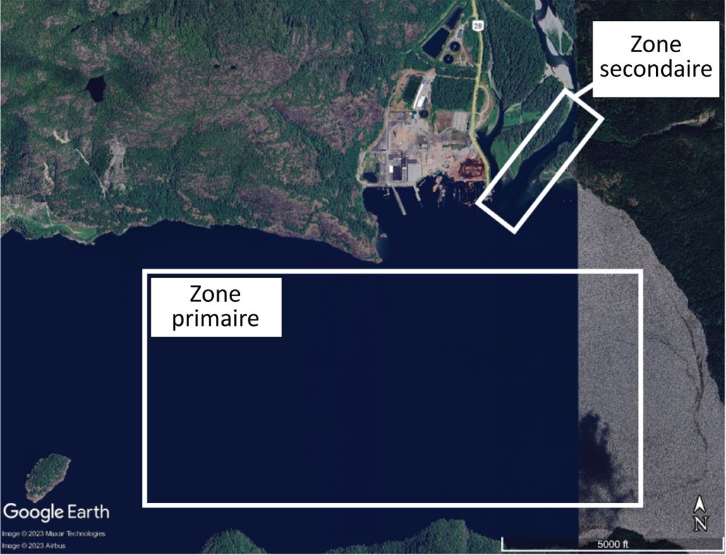 Lorsque l’état de la mer est indésirable, l’exploitant recommande, pour le décollage et l’atterrissage, l’utilisation de la partie sud-ouest de l’embouchure de la rivière Gold (marquée comme la zone secondaire dans la figure 2), qui offre une surface d’environ 1700 pieds. Cette zone secondaire peut être protégée les vents perturbant le passage; toutefois, comme l’a fait remarquer l’exploitant, on a observé que les vents en altitude dans cette zone sont imprévisibles (figure 2).