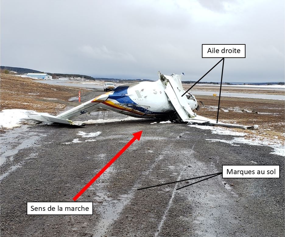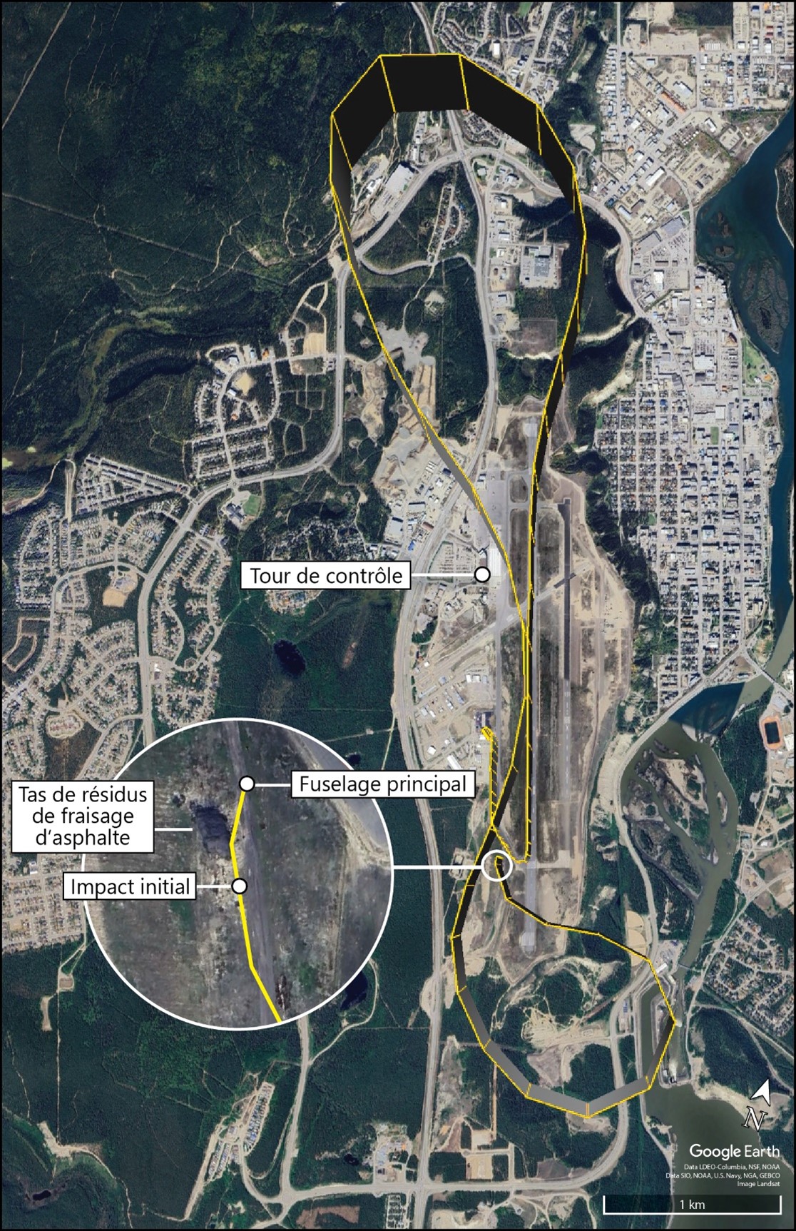 À 11 h 34, heure normale des Rocheuses, le 17 avril 2023, l’aéronef Pilatus Aircraft Ltd. PC-12/47E (immatriculation C-GMPX, numéro de série 1017) exploité par le gouvernement du Canada, Gendarmerie royale du Canada, a quitté l’aéroport international de Whitehorse/Erik Nielsen (CYXY) (Yukon) pour un vol selon les règles de vol aux instruments à destination de l’aéroport de Yellowknife (CYZF) (Territoires du Nord-Ouest). Le pilote était le seul occupant de l’aéronef. Peu après que l’aéronef a décollé de la piste 32L, son avertisseur de décrochage s’est activé, déclenchant un avertissement sonore « STALL » et l’activation du vibreur de manche. Le pilote a informé le contrôleur tour de son intention de revenir pour atterrir. À 11 h 38, alors que le pilote manœuvrait visuellement pour atterrir sur la piste 32L, l’aéronef est entré en collision avec le relief à environ 520 pieds à l’ouest-sud-ouest du centre du seuil décalé, dans une assiette inclinée à droite. L’aéronef a ensuite heurté un tas de résidus de fraisage avec son aile gauche, a basculé sur son côté gauche et a glissé sur environ 130 pieds avant de s’immobiliser sur une route de service de l’aéroport. Grièvement blessé, le pilote est sorti de l’aéronef par l’issue de secours avec l’aide du personnel de sauvetage et lutte contre les incendies d’aéronefs, qui est arrivé dans les minutes qui ont suivi l’accident. Un signal de radiobalise de repérage d’urgence a été reçu par le système de recherche et de sauvetage par satellite. L’aéronef a été détruit; aucun incendie ne s’est déclaré après l’impact.