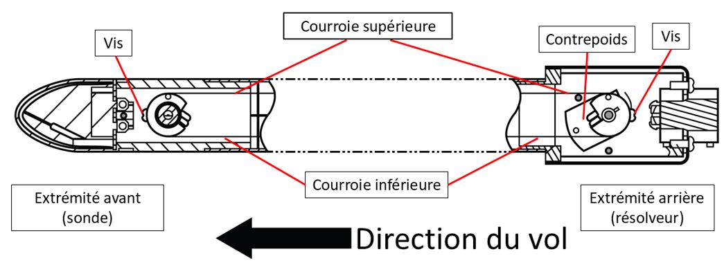 Si la courroie inférieure devait être sectionnée ou détachée de l’une ou l’autre des poulies, la rotation de la girouette ne serait pas transmise au résolveur et les forces de traction d’alignement sur la courroie seraient perdues. L’angle de rotation libre du contrepoids (sous l’effet des forces gravitationnelles) est supérieur à sa plage d’angles de rotation nominale lorsque la courroie est intacte. Par conséquent, si la courroie inférieure était rompue ou se détachait, quelle que soit l’assiette en vol, les forces gravitationnelles entraîneraient la rotation et la chute du contrepoids au fond du résolveur.