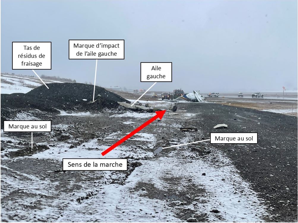 À 11 h 38 min 16 s, l’aile droite de l’aéronef a heurté le sol à environ 520 pieds à l’ouest-sud-ouest du milieu du seuil décalé de la piste 32L. Quelques instants plus tard, l’aile gauche a percuté un tas de résidus de fraisage gelésLes résidus de fraisage, aussi appelés agrégats, sont des morceaux de pierre ou de béton recyclés et concassés qui peuvent être transformés et utilisés dans de nouveaux projets de construction. Dans l’événement à l’étude, le tas était constitué de résidus de fraisage d’asphalte., ce qui a provoqué la séparation de l’aile gauche de l’aéronef. L’aéronef a roulé sur son côté gauche et a glissé sur environ 130 pieds avant de s’immobiliser sur une route de service de l’aéroport, à environ 210 pieds au nord du point de contact initial et 480 pieds à l’ouest du milieu du seuil décalé.