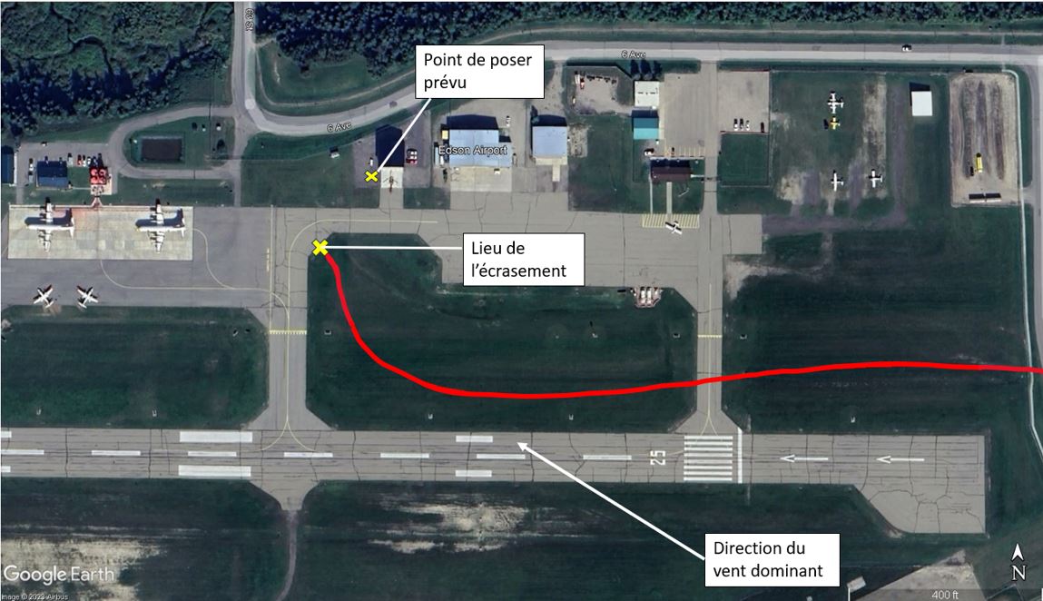 Le 4 mai 2023, l’hélicoptère Airbus Helicopters AS350 B2 exploité par Range Helicopters Inc. (Range Helicopters) (immatriculation C-FAVX, numéro de série 4242) effectuait un vol de retour vers l’aéroport d’Edson (CYET) (Alberta), à partir d’une zone de rassemblement pour la lutte contre les incendies de forêt située à environ 49 milles marins (NM) à l’est. Lorsque l’hélicoptère se trouvait à 5 NM à l’est de CYET, un vol de 4 aéronefs CL-215T de Canadair approchait de l’aéroport par l’ouest et avait l’intention d’atterrir sur la piste 07, qui était alors en service. Des vents forts soufflant en rafales de l’est-sud-est ont été signalés. L’approche habituelle du pilote de l’événement vers le hangar de Range Helicopters à CYET consistait à passer au sud de la ville d’Edson (Alberta), puis à approcher de l’aéroport par l’ouest. Quand il a entendu les intentions des aéronefs CL-215T, le pilote de l’événement, ne voulant pas retarder leur arrivée, a décidé d’approcher de l’aéroport en vent arrière et au nord de la piste 07, entre la piste et la voie de circulation, et avait l’intention d’effectuer un virage serré à droite pour mettre l’hélicoptère face au vent (Figure 1).