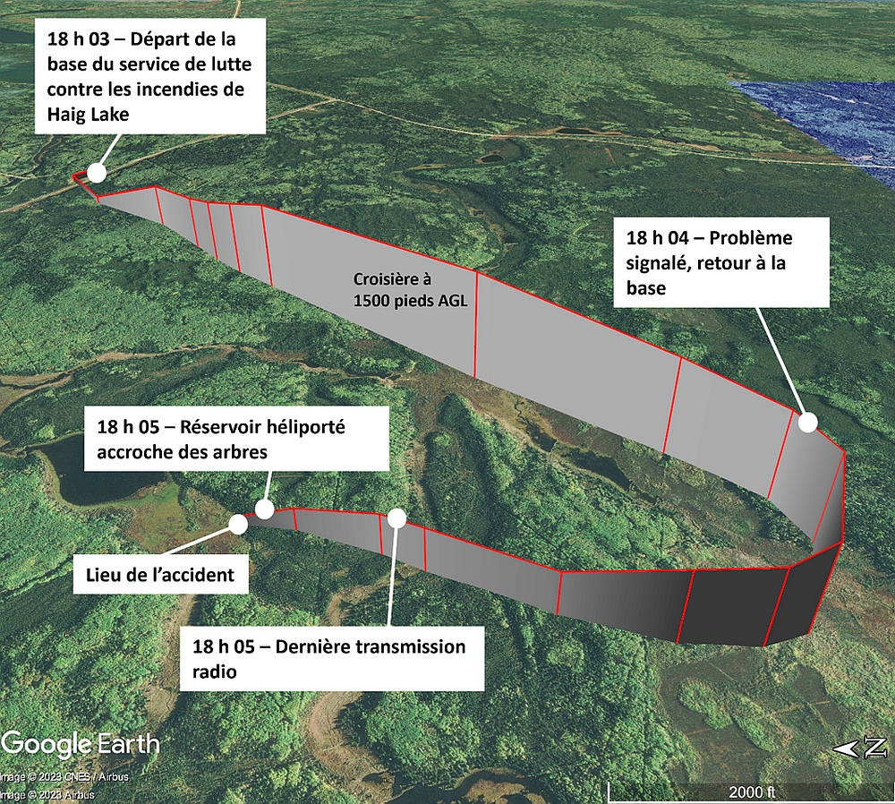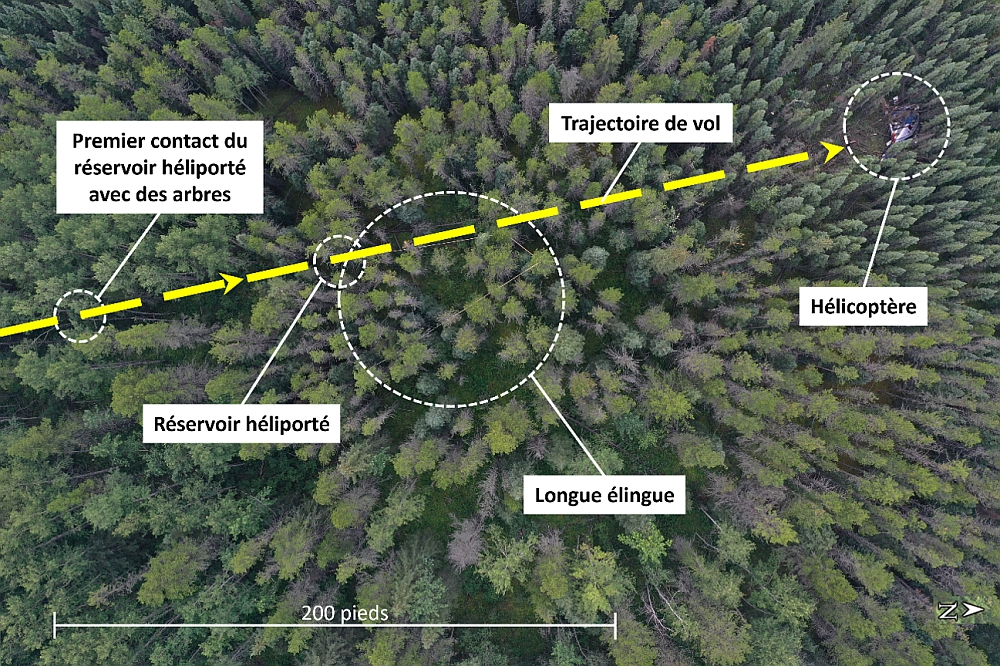Peu de temps après, le réservoir héliporté est entré en contact avec des arbres, puis s’est enchevêtré dans un arbre. Le pilote a largué la longue élingue en activant le largage manuel (aussi appelé largage mécanique); peu après, l’hélicoptère a percuté le sol en piqué et incliné à gauche (figure 1).