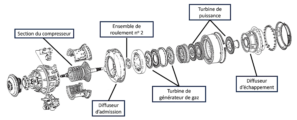 Dans un turbomoteur, comme celui à l’étude, le diffuseur d’échappement a pour fonction de réduire la contre-pression des gaz d’échappement quittant la turbine à gaz et de rediriger les gaz chauds. Dans le moteur de la série T53, ce diffuseur sert également de support aux roulements n° 3 et n° 4, qui eux-mêmes supportent le rotor de la turbine de puissance et l’extrémité arrière de l’arbre de puissance.