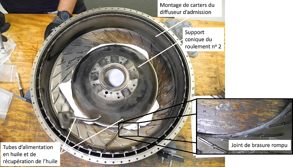 Un démontage du moteur de l’aéronef à l’étude a été effectué dans le cadre de l’enquête. On a déterminé que la rupture de la brasure du support conique du roulement no 2 du diffuseur d’admission avait fait en sorte que le montage de carters du diffuseur d’admission et le roulement no 2 avaient perdu leur support et que le rotor du compresseur était entré en contact avec l’arbre de puissance. De plus, le fait que les buses et le cylindre du générateur de gaz ont perdu leur support a fait en sorte qu’ils sont entrés en contact avec les composantes rotatives du générateur de gaz. La rupture de la brasure a été précipitée par un défaut indéterminé au moment de la fabrication.