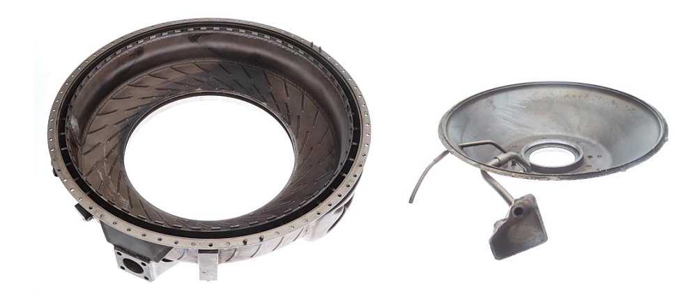L’examen des composants du diffuseur d’admission a révélé que le support conique du roulement no 2 était brasé au montage de carters du diffuseur d’admission et que la totalité de la circonférence de la brasure, en plus des extrémités extérieures des tubes d’alimentation en huile et de récupération de l’huile, s’étaient rompues. Les 2 composants séparés ne semblaient présenter aucune marque de démontage ou de réparation antérieurs, comme le meulage, le ciselage ou un autre moyen mécanique qui aurait gâché les surfaces. Les soudures d’angle intermittentes semblaient être les soudures originales du fabricant d’équipement d’origine, étant similaires aux autres soudures du montage de carters du diffuseur d’admission.