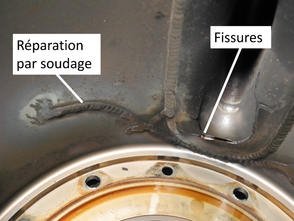Plusieurs réparations par soudage et fissures ont été relevées sur le diffuseur d’échappement à l’étude. Plusieurs fissures ont été relevées dans chaque bras de support intérieur du logement du roulement de la turbine de puissance (figure 6).