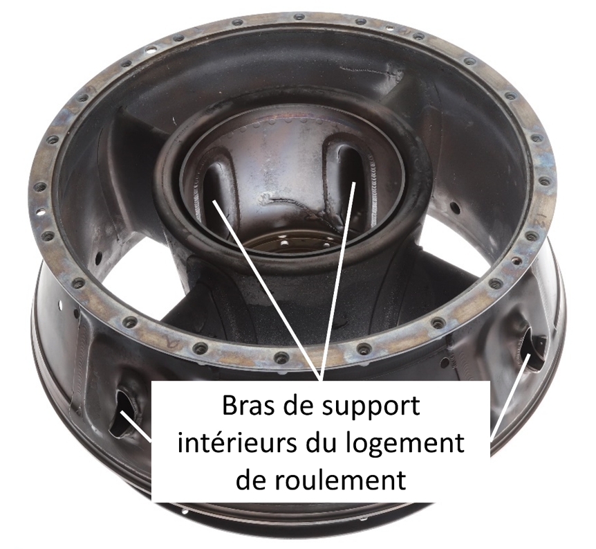 Toutefois, dans l’événement à l’étude, l’importance des fissures relevées dans le diffuseur d’échappement était liée à la perte du support du roulement no 2 au niveau du diffuseur d’admission. Cette perte aurait ajouté une charge supplémentaire sur les bras de support intérieurs (figure 7) du logement des roulements de la turbine de puissance du diffuseur d’échappement (n° 3 et n° 4).