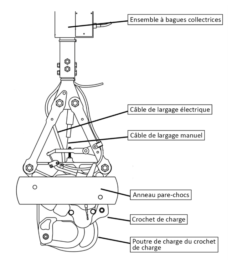 [traduction] Les principaux éléments du crochet de charge sont la poutre de charge, le mécanisme interne et un solénoïde à courant continu. La poutre de charge supporte la charge et est verrouillée par le mécanisme interne. Le solénoïde à courant continu et un câble de largage manuel externe permettent de déverrouiller la poutre de charge.
