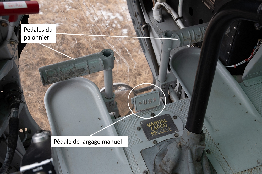 La pédale de largage manuel est située entre les palonniers. Son emplacement et la force nécessaire pour enfoncer cette pédale réduisent le risque d’activation accidentelle. Comme l’indique le supplément du manuel de vol de Onboard Systems International, LLC, le largage manuel doit être utilisé en premier, car il offre un largage plus décisif de la charge que le largage électriqueOnboard Systems International, LLC, no de document 021-0021-00, FAA Approved Rotorcraft Flight Manual Supplement – STC SR00713SE: Cargo Hook Suspension Kits, révision 7 (15 février 2022), section 2-9 : In-flight Operations, sous-section 3 : Emergency Procedures, p. 20 de 22..