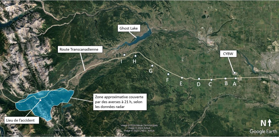 À 20 h 40, l’aéronef a circulé devant la tour de contrôle pour faire le point fixe avant le décollage. Trois minutes plus tard, le pilote a communiqué avec le contrôleur sol pour l’informer que le point fixe était terminé et qu’il était prêt à recevoir l’autorisation de circuler vers la piste en service. Le contrôleur tour de CYBW a demandé au pilote de vérifier sa route de vol prévue vers CZAM. Le pilote a confirmé qu’il prévoyait suivre la route Transcanadienne, une route VFR désignéePour obtenir de plus amples renseignements sur la route VFR désignée, voir la section 1.18.2 Route de vol selon les règles de vol à vue. qui traverse les montagnes Rocheuses, en direction ouest à 5500 pieds au-dessus du niveau de la mer (ASL). L’aéronef a alors décollé de la piste 08 à 20 h 47.