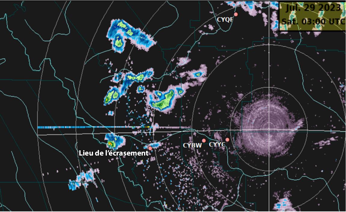 Les images radar météorologiques de la zone au moment de l’événement indiquaient aussi la présence d’une cellule de précipitation se déplaçant dans la zone du lieu de l’accident entre 20 h 50 et 21 h 10 (figure 3). Les échos radar de légères averses de pluie tombant dans cette masse d’air près de l’heure de l’accident auraient ajouté de l’humidité à la basse atmosphère, augmentant l’humidité et permettant aux nuages de descendre plus bas vers le sol.