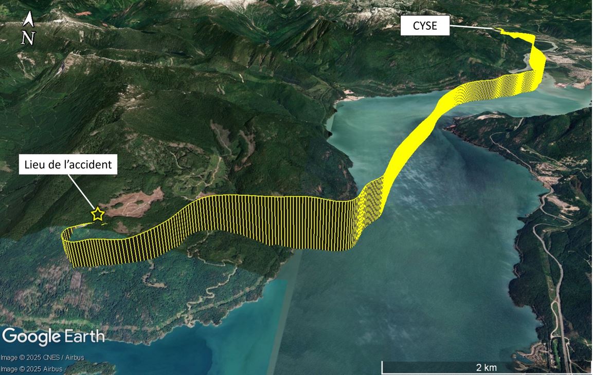 L’aéronef a décollé de la piste 15 vers 17 h 08Les heures sont exprimées en heure avancée du Pacifique (temps universel coordonné moins 7 heures).. Il a suivi la trajectoire approximative de la rivière Squamish en direction sud, montant à un peu plus de 2200 pieds au-dessus du niveau de la mer (ASL) avant d’entamer une descente. Il a ensuite volé entre 1600 et 1550 pieds ASL, effectuant plusieurs changements de cap tout en se dirigeant vers le sud-ouest.