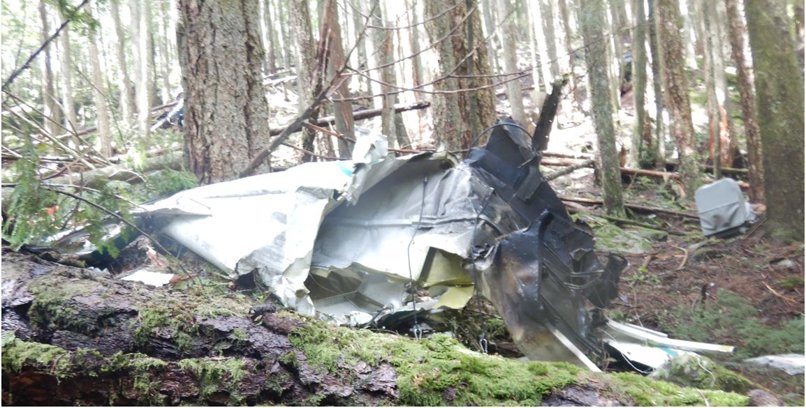 L’épave de l’aéronef a été retrouvée dans un secteur densément boisé au relief montagneux et accidenté. L’épave présentait des signes d’un impact à haut régime et a été retrouvée en morceaux le long d’une traînée de débris linéaire de 111 m (environ 364 pieds). L’état de l’épave était cohérent avec un piqué en spirale menant à une collision avec le relief. L’espace habitable à l’intérieur de l’aéronef a été compromis (figure 3). Les enquêteurs ont pu confirmer que les gouvernes et les surfaces portantes étaient intactes jusqu’au contact avec les arbres et le relief. L’accident n’offrait aucune chance de survie.