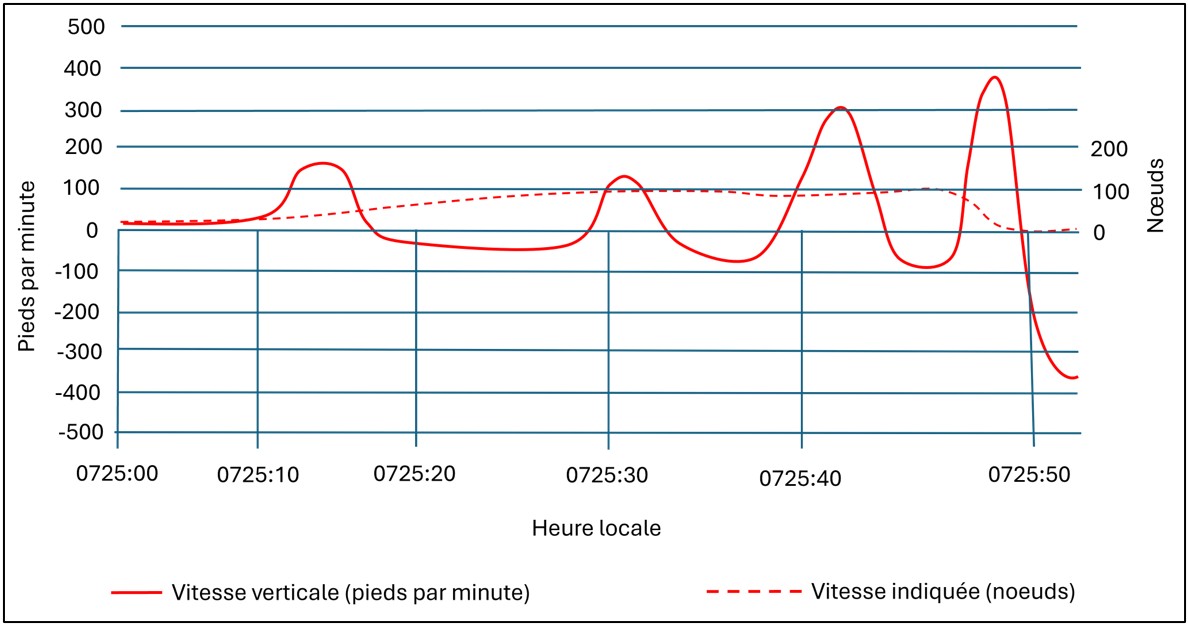 La PIO, aussi appelée marsouinage ou porpoising en anglais, peut représenter un défi notable pour les pilotes lors de la phase d’atterrissage d’un vol. Comme l’explique la Federal Aviation Administration (FAA) des États-Unis dans son Airplane Flying Handbook [traduction] : « en cas de rebond mal récupéré à l’atterrissage, l’avion se présente nez devant, ce qui déclenche une série de mouvements imitant les sauts et plongeons d’un marsouin »Federal Aviation Administration (FAA), FAA-H-8083-3C, Airplane Flying Handbook (2021), chapitre 9 : Approaches and Landings, p. 9-34.. Comme dans le cas du vol à l’étude (figure 3), la série d’oscillations va en s’amplifiant.