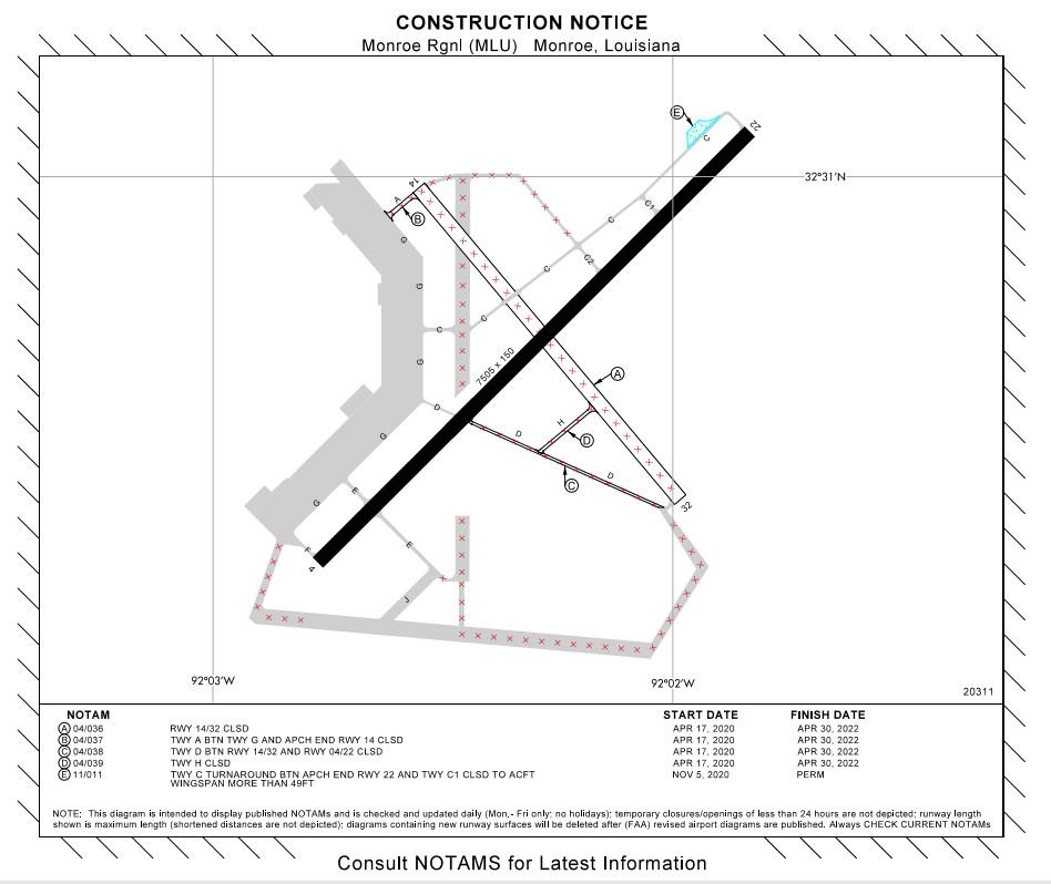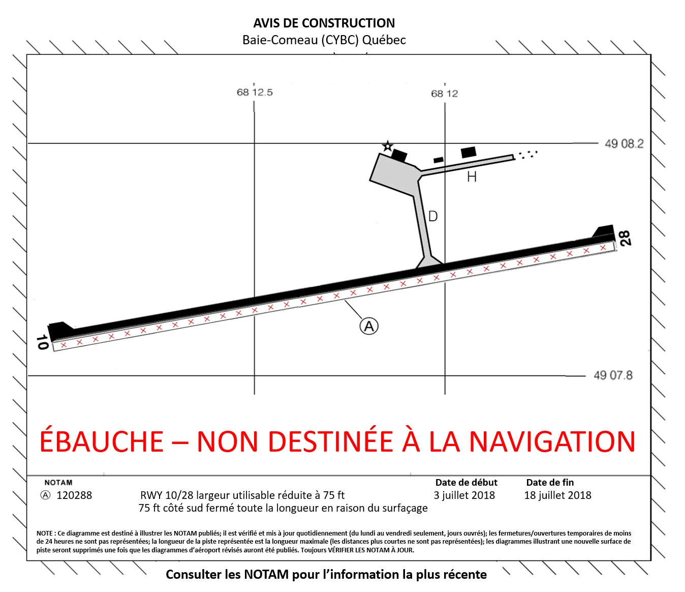 Les exploitants d’aéroports peuvent également faire publier un supplément de l’AIP Canada (OACI) qui, contrairement au NOTAM, peut contenir des éléments graphiques. Cependant, même si les suppléments de l’AIP Canada (OACI) sont publiés tous les 28 jours, les exploitants d’aéroport doivent fournir l’information à publier à NAV CANADA au moins 49 jours avant la date de publication. Pour beaucoup d’exploitants d’aéroport, les délais de publication des suppléments sont incompatibles avec les imprévus pouvant se produire durant la planification de travaux de réfection de pistes.