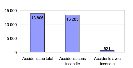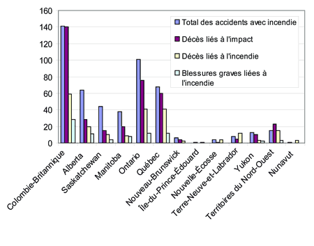 Ces 13 806 accidents ont fait 3311 morts et 2217 blessés graves. Les 521 accidents avec incendie ont fait 728 morts, soit 22 % du nombre total de morts, et 231 blessés graves, soit 10,4 % du nombre total de blessés graves. Par comparaison avec les chiffres correspondant au total des accidents, le taux de mortalité des accidents avec incendie est 5,5 fois plus élevé, et le taux des blessures graves est presque le triple.