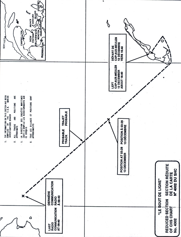 Dans l'après-midi du 12 décembre, les forts vents du nord-ouest se sont apaisés et les prévisions météorologiques indiquaient que le vent tournerait bientôt au sud-est. Le «LE BOUT DE LIGNE» est donc reparti de Cap-aux-Meules vers 16 h 40Note de bas de page 3 et a informé la station radio de la Garde côtière (SRGC) de Cap-aux-Meules (indicatif d'appel VCN) qu'il comptait se diriger vers l'île Le Corps-Mort et, de là, directement vers le cap de Gaspé. La distance à parcourir était d'environ 170 milles. (Voir l'annexe A.)