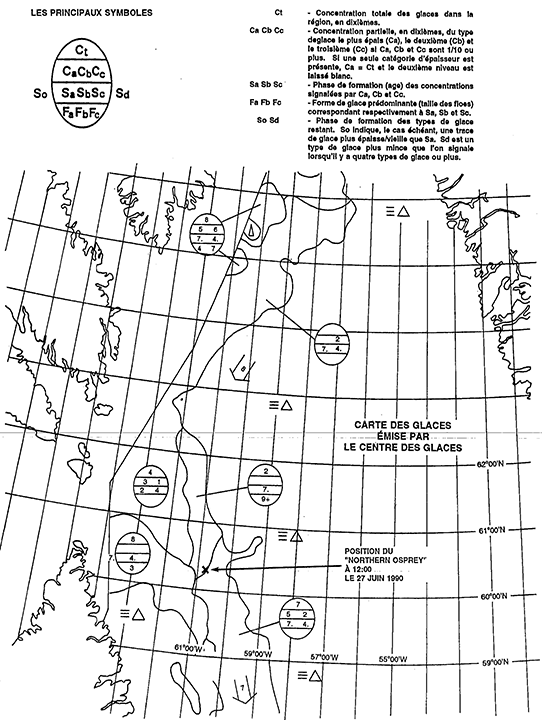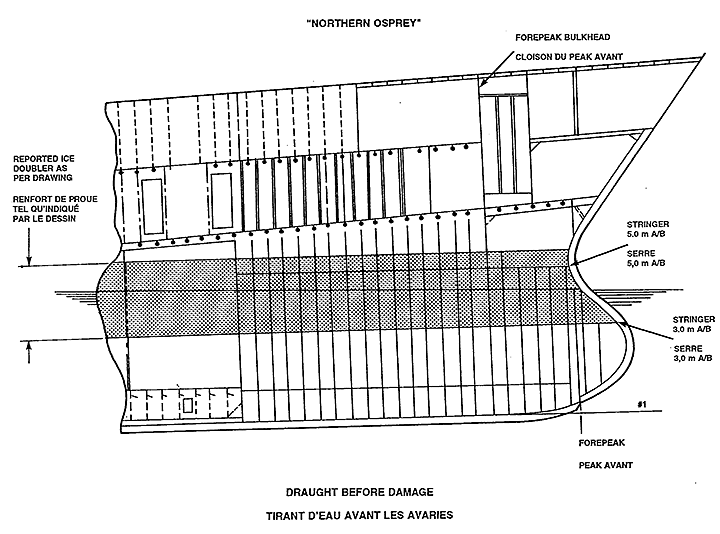 Les conditions de glace dans lesquelles le « NORTHERN OSPREY » évoluait avant le naufrage correspondaient aux prévisions : les deux dixièmes de la surface de la mer environ étaient couverts de vieilles glaces flottantes et il y avait de fortes concentrations de bandes de glace de plusieurs années. Le capitaine a signalé des plaques de glace émergeant de un mètre au-dessus de la surface et on a signalé dans les environs des épaisseurs de glace dépassant les 140 cm (55 pouces). Les estimations faites par le capitaine de la hauteur émergée de la glace indiquent que celle-ci pouvait s'étendre jusqu'à une profondeur de neuf mètres sous la surface.