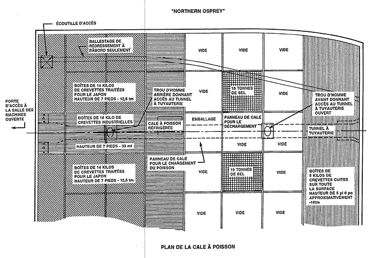 Le système d'assèchement des fonds de cale a été incapable de pomper le carburant qui a envahi la cale à poisson jusqu'à une hauteur d'environ 0,5 m aux environs du couvercle du trou d'homme du tunnel à tuyauterie, toutefois, il y avait plus de carburant vers l'arrière bâbord. Le couvercle du trou d'homme entre le tunnel à tuyauterie et la cale à poisson a été enlevé et la porte d'accès entre le tunnel à tuyauterie et la salle des machines a été ouverte pour permettre au carburant qui s'était accumulé dans la cale à poisson de s'écouler par le tunnel à tuyauterie vers la salle des machines d'où il était pompé à la mer.