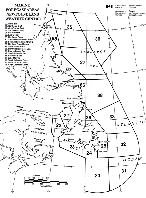 Pendant le voyage entre les lieux de pêche et St. John's, le «STRAITS PRIDE II» a dû traverser le secteur de prévisions météorologiques maritimes de la côte est et, pendant qu'il pêchait dans la zone de pêche 3L, il était dans les secteurs du banc de l'île Funk et des Grands Bancs Nord (voir l'annexe C) desservis par le Centre météorologique de Terre-Neuve.