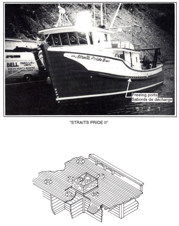 Le «STRAITS PRIDE II» a été construit et inspecté conformément aux exigences du Règlement sur l'inspection des petits bateaux de pêche pris en vertu de la Loi sur la marine marchande du Canada pour un bâtiment de cette taille et de cette jauge. Des planches de séparation amovibles en aluminium divisaient la cale à poisson en 12 compartiments. Pour faciliter le chargement du poisson dans la cale à poisson, il y avait une écoutille de 1,5 m sur 2,2 m munie d'un écoutillon dans la partie arrière de la hiloire. De plus, six écoutillons à plat-pont, deux de chaque côté, à bâbord et à tribord, et un à l'avant et à l'arrière de l'écoutille principale, servaient aussi au chargement du poisson. Chaque écoutillon possédait un couvercle en aluminium qui pouvait être fermé hermétiquement par un mécanisme à simple action activé par une clé. Le panneau principal en aluminium était percé d'une porte étanche indépendante. Il était possible d'accéder à la cambuse par un couvercle de trou d'homme en aluminium pourvu du même dispositif de fermeture étanche.
