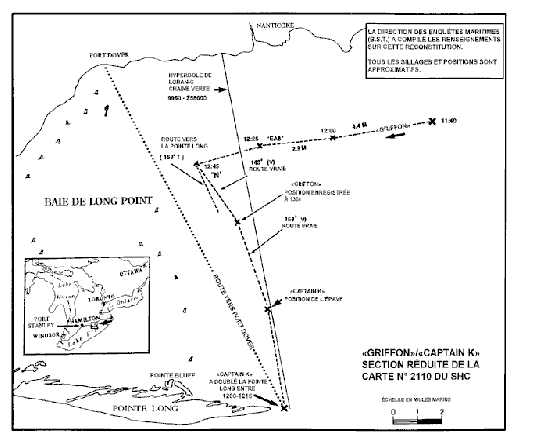 Le 18 mars 1991 vers 13 h 20, en sortant de la baie de Long Point, le NGCC «GRIFFON» est entré en collision avec le bateau de pêche canadien «CAPTAIN K» qui rentrait au port. La visibilité était considérablement réduite par la brume. Le «CAPTAIN K» a coulé presque immédiatement; les corps des trois membres de l'équipage ont plus tard été retrouvés dans l'épave au moment du renflouement du «CAPTAIN K». Le bateau de pêche, lourdement endommagé, a été déclaré perte implicite totale; le navire de la Garde côtière canadienne n'a subi que quelques éraflures mineures.
