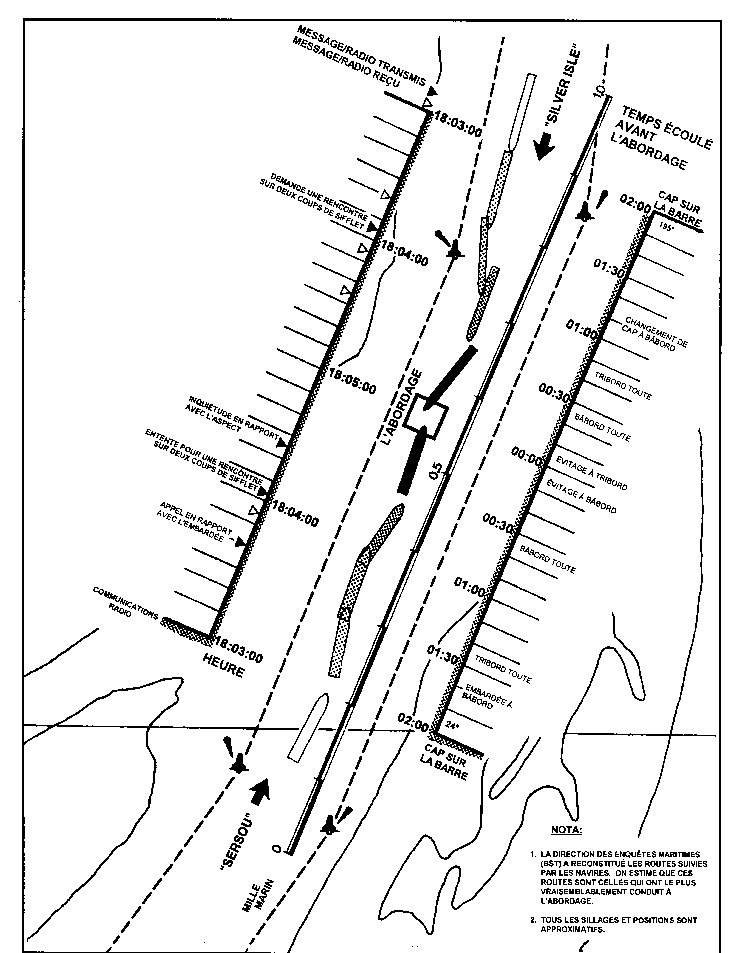 Selon les enregistrements audio des STM de Montréal, une situation potentiellement dangereuse avait commencé à se créer à 18 h 3 min 40 s quand le pilote du «SERSOU» a averti le «SILVER ISLE» par radio de surveiller le «SERSOU» puisque la barre était à droite toute en vue de contrer l'évitage à bâbord du navire.