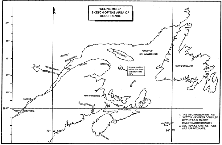 Arès avoir débarqué le pilote à Les Escoumins (Québec) le matin du 30 novembre 1991, le navire a effectué un arrêt d'une dizaine d'heures au mouillage près de l'île du Bic (Québec) pour assujettir les conteneurs. Le lendemain matin, 1er décembre, le «CELINE METZ», en direction du golfe du Saint-Laurent, roulait modérément par forte mer arrière. Vers 10 h 45Note de bas de page 3 , alors que le navire était à quelque 50 milles à l'est de la péninsule de Gaspé, il a gîté fortement d'environ 30° sur tribord, s'est redressé partiellement et est demeuré incliné de 11° sur tribord.