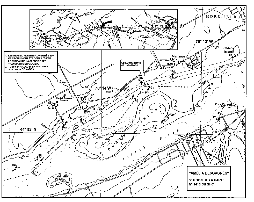 Les chenaux étroits offrent très peu d'espace de manoeuvre aux navires plus gros et il peut être risqué pour de tels bâtiments de ralentir ou de stopper dans de forts courants ou des vents de travers. À une vitesse en surface de 10 kn, le «AMÉLIA DESGAGNÉS» aurait franchi les trois encablures qui le séparait de la «6E7221» en panne en moins de deux minutes. Le «AMÉLIA DESGAGNÉS» n'aurait eu qu'un choix limité de mesures à prendre, même si la présence de la «6E7221» avait été remarquée immédiatement.