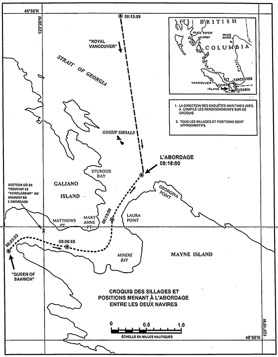 À 8 h 17 min 30 s, le premier contact radio entre le «QUEEN OF SAANICH» et le «ROYAL VANCOUVER» a été établi. À 8 h 18, même si les navires se voyaient l'un l'autre et que tous deux avaient exécuté des manoeuvres d'urgence, ils se sont abordés de front par une position d'où le feu Georgina se trouvait au 127° à une distance de 0,22 M. Au moment de l'abordage, le «DEBBIE J», qui avait dépassé le «QUEEN OF SAANICH», se trouvait sur l'avant tribord de celui-ci, à proximité de l'île Mayne, et le «SCHOLARSHIP» se trouvait à quelque 2,5 M du lieu de l'événement.