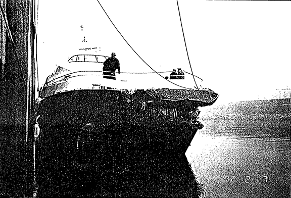 L'ancre du «ROYAL VANCOUVER» a labouré le bordé de pont du «QUEEN OF SAANICH» avant d'aller heurter la porte d'étrave bâbord. Un joint soudé d'une tige articulée en acier retenant la porte a cédé et celle-ci s'est effondrée sur le pont principal où elle a endommagé deux véhicules. Une analyse a révélé qu'il y avait un défaut caché dans ce joint soudé par suite d'une réparation antérieure. Les éraflures et les éclats de peinture du côté bâbord du traversier indiquent que le boudin de bâbord du traversier a probablement heurté le gaillard d'avant et le flotteur de bâbord du catamaran.