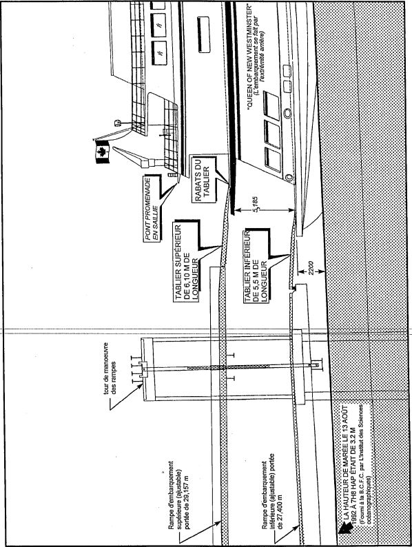 Le «QUEEN OF NEW WESTMINSTER» est arrivé au quai no 3 de Departure Bay à 7 h 443 et, après avoir laisser descendre des passagers et des véhicules, il a commencé à embarquer des véhicules et à laisser monter des passagers. Vers 8 h, une fourgonnette, ayant à bord cinq passagers en plus du conducteur, a reçu l'ordre de quitter l'aire de transit principale pour monter à bord du traversier par la rampe supérieure (voir croquis de l'annexe A). Le traversier avait alors quelques minutes de retard sur l'horaire publié. L'officier du pont supérieur (OPS), voyant que l'embarquement était presque terminé, s'est rendue sur la passerelle pour aider le capitaine. Avant de partir, elle a confié à un matelot la responsabilité de l'embarquement des derniers véhicules. Ce matelot, qui était en train de placer un véhicule tirant une remorque déjà à bord, a interrompu l'embarquement des véhicules. Vers 8 h 8, la fourgonnette s'est immobilisée sur le tablier de la rampe, ses roues avant se trouvant sur les rabats de raccordement (voir photo de l'annexe B), dans l'attente d'autres instructions. Les témoignages ne concordent pas concernant le message d'autorisation qu'aurait transmis la préposée à la tour (PT) et celui qu'aurait reçu le préposé à la rampe inférieure (PRI). Quoi qu'il en soit, le traversier a appareillé prématurément à 8 h 9.