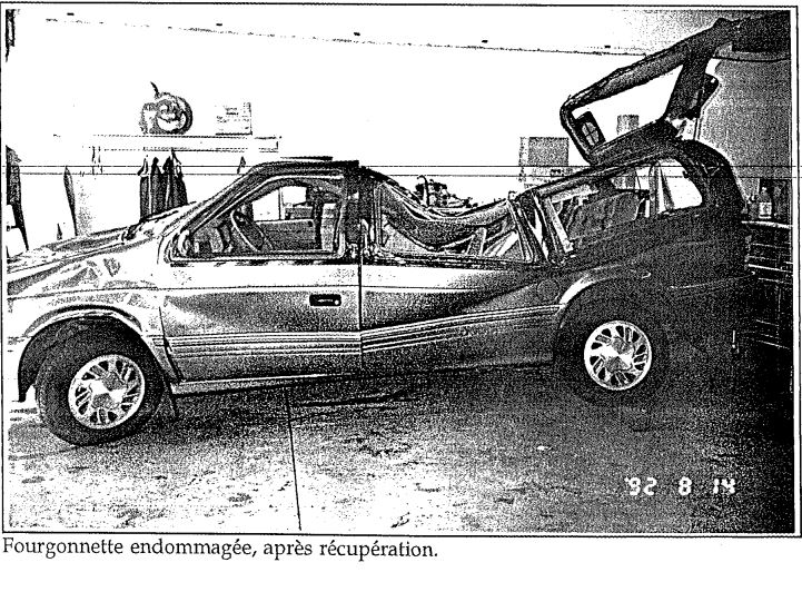 Une passagère de la fourgonnette assise près de la porte latérale a vu qu'il se passait quelque chose d'anormal et a fait coulisser la porte du véhicule pour descendre sur le tablier. À peu près au même moment, le tablier et les rabats, n'étant plus supportés par le pont du traversier, se sont brusquement abaissés et la passagère de la fourgonnette a été projetée à l'eau. Le véhicule s'est écrasé sur le pont inférieur avant de tomber à l'eau dans le sillage du traversier qui appareillait (voir photos de l'annexe B).