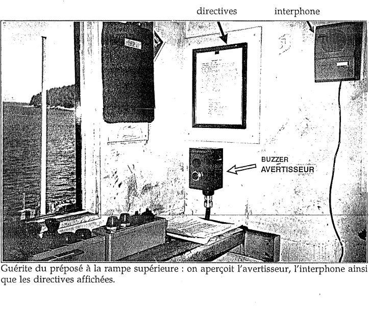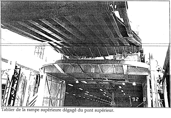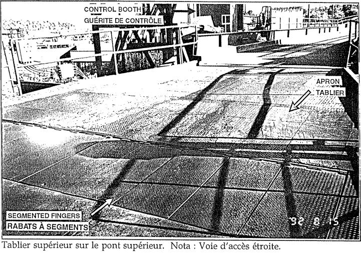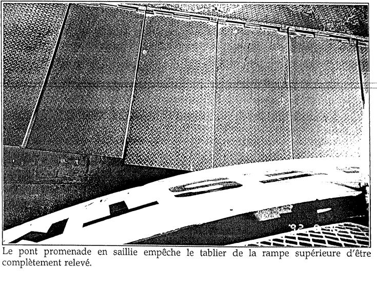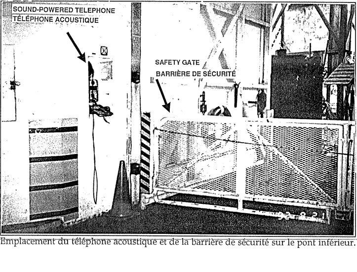Sur le pont-garage supérieur, la fourgonnette attendait toujours sur le tablier lorsque le traversier s'est soudainement éloigné du quai. Le PRS a couru à sa guérite pour actionner le commutateur de blocage hydraulique, mais il était déjà trop tard (voir photos de l'annexe B). Il a averti la tour par radio qu'un véhicule était tombé de la rampe. La PT lui a demandé de répéter le message, puis a répondu qu'on allait appeler une ambulance. Lorsque le traversier a commencé à s'éloigner, le MPS a téléphoné à la passerelle pour avertir le personnel navigant qu'un véhicule qui se trouvait sur le tablier était en train de tomber et pour demander qu'on stoppe le navire. Il a ensuite lancé une bouée de sauvetage à l'arrière et fermé les portes arrière afin d'assurer la sécurité des autres passagers. L'OPI a vu une femme tomber de ce qui lui a semblé être la rampe supérieure. Il a actionné le signal d'alerte pour la passerelle, soit cinq coups d'avertisseur, et téléphoné pour indiquer que quelqu'un était tombé à l'eau. Les appels provenant des deux ponts sont arrivés presque en même temps à la passerelle. Les rapports sont parvenus au capitaine par l'intermédiaire de l'OPS et celui-ci, voyant «quelque chose» dans l'eau sur le moniteur vidéo, a manoeuvré le traversier pour assurer la sécurité des personnes dans l'eau.