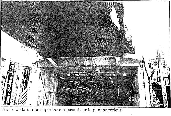 On accède aux ponts du navire par des rampes hydrauliques à double niveau avec jambes de force. La rampe elle-même est articulée côté quai par une charnière fixée aux ouvrages terrestres ce qui permet d'ajuster la hauteur de la rampe côté navire. Il y a, de part et d'autre de la rampe, une tour conçue pour recevoir l'axe de blocage actionné hydrauliquement. Du côté navire, la rampe est prolongée par un tablier articulé à contrepoids terminé par des rabats en acier, ce qui permet aux véhicules de passer en douceur de la rampe au pont du navire. Le tablier ne peut supporter le poids des véhicules que lorsqu'il repose sur le pont du traversier; il est alors placé en mode «flottant», de façon à suivre les mouvements du pont du traversier sans que le préposé n'ait à l'ajuster constamment. Le Guide de manoeuvre des rampes ne mentionne pas qu'il est dangereux d'immobiliser un véhicule sur le tablier.