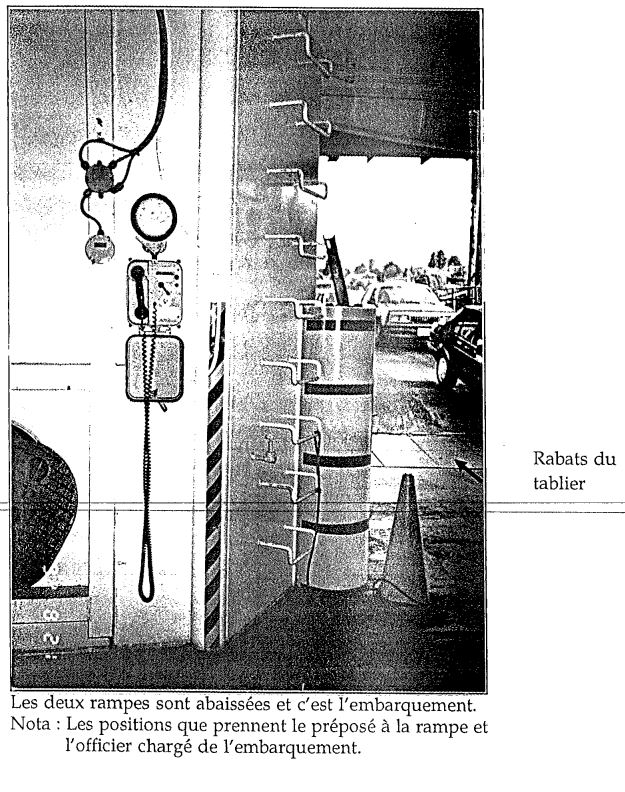 Au moment de l'accident, il y avait deux PT de service, dont l'un en pause-repas. Lorsqu'on a eut terminé l'embarquement de tous les gros véhicules commerciaux sur le pont inférieur, l'OPI a demandé au PRI d'envoyer quelques véhicules. Ce dernier a été averti qu'il y avait une voie et demie de voitures (environ 25) dans l'aire de transit principale, dont une «voie» était envoyée au pont inférieur. Peu après, l'OPS a demandé au PRS de lui envoyer six autres véhicules pour «compléter» son chargement. L'information a été transmise au «répartiteur» qui a envoyé six véhicules de l'aire de transit principale à la rampe à une seule voie donnant accès au pont supérieur. Comme l'embarquement était presque terminé et que le traversier était en retard sur son horaire, l'OPS s'est rendue sur la passerelle afin d'aider le capitaine pour l'appareillage comme le voulait l'usage à bord, laissant deux matelots s'occuper des véhicules. Selon la procédure établie, l'OPS n'était pas obligée de rester sur le pont supérieur jusqu'à ce que le tablier soit libre et dégagé du navire. Peu après, l'un des deux matelots s'est rendu à l'avant pour exécuter les tâches d'appareillage qui lui étaient assignées, tandis que l'autre, le responsable, qui était désormais seul, était occupé à déplacer des véhicules sur le pont supérieur pour faire de la place pour les autres. Ce faisant, il a demandé à l'avant-dernier véhicule, une fourgonnette avec six personnes à bord, de s'arrêter, ce qu'elle a fait alors qu'elle se trouvait sur le tablier.