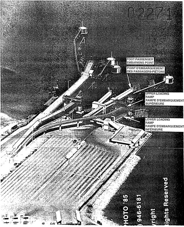 Le terminal de Departure Bay dessert deux liaisons avec le continent, l'une avec Horseshoe Bay (Colombie-Britannique), et l'autre avec Tsawwassen. Le terminal possède deux aires de transit des véhicules, dont l'une est exclusivement réservée pour le pont supérieur du «QUEEN OF NEW WESTMINSTER». Elle a une capacité d'environ 120 voitures et est appelée «zone jaune». Les véhicules de moins de 3,048 m (10 pi) de hauteur sont dirigés vers cette zone d'où ils embarquent directement sur le pont supérieur du navire au quai no 3. Les véhicules commerciaux, ceux d'une hauteur élevée, ainsi que le reste des véhicules ordinaires sont dirigés vers une autre aire de transit pour être embarqués sur le pont inférieur du traversier. Le pont d'embarquement surélevé à une seule voie qui mène à la rampe supérieure a environ 160 m de long (voir l'annexe C).
