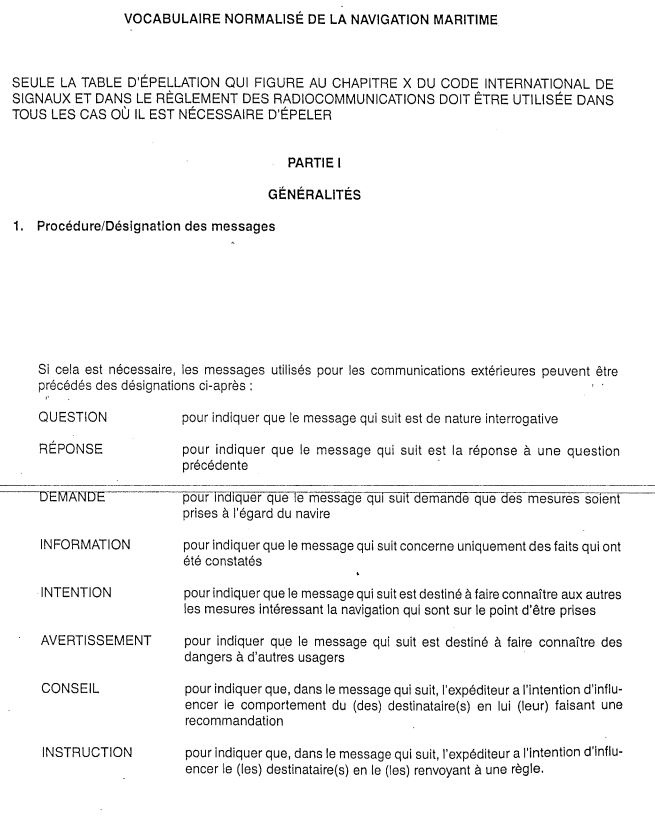 Le Vocabulaire normalisé de la navigation maritime publié par l'Organisation maritime internationale (OMI) s'inspire des principes fondamentaux essentiels à une communication efficace en vue de la sécurité. En l'utilisant pour les communications, on élimine tout risque de malentendu et d'ambiguïté susceptible de compromettre la sécurité des opérations. On y insiste sur la nécessité de répéter toute partie du message qui est considérée comme suffisamment importante pour justifier une précaution supplémentaire, par exemple «Ne pas, je répète, ne pas traverser». En outre, il répète que lorsqu'un message contient un conseil ou des directives, la station réceptrice qui accuse réception du message doit en répéter l'essentiel (voir l'annexe D).