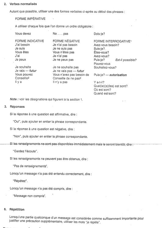 Le guide contient une liste de quelques termes et expressions choisis, par ex. «tout est paré». En l'occurrence, l'embarquement à bord du traversier n'était pas terminé lorsqu'une autorisation conditionnelle a été donnée. On a utilisé un langage non normalisé pour la communication et les messages n'ont pas tous été répétés en entier.