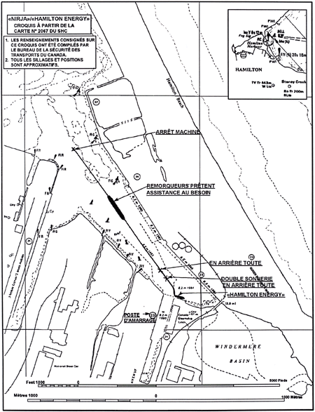 Lorsque le navire est chargé, il peut atteindre 4 kn et 6 kn à «en avant très lente» et à «en avant lente», respectivement, tandis que lorsqu'il est sur lest, ces vitesses augmentent de 1 kn. Le navire doit maintenir une allure d'au moins 4,2 kn lorsqu'il est chargé et de 4,6 kn quand il est sur lest afin de conserver l'erre nécessaire pour gouverner. Si la machine est à «en avant lente» et que l'on commande un arrêt d'urgence, le navire, s'il est chargé, parcourra encore 1,4 mille marin (M) et il lui faudra environ 6 minutes pour s'arrêter; ces valeurs diminuent à 0,7 M et 4 minutes 40 secondes, respectivement, si le navire est sur lest (voir l'annexe B).