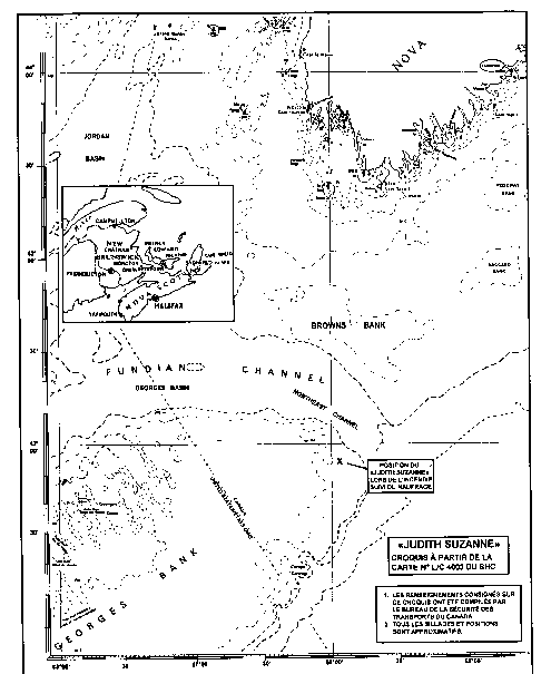 Le «JUDITH SUZANNE» a appareillé de Liverpool (Nouvelle-Écosse) vers 10 hNote de bas de page 3, le 17 septembre 1993, pour ce qui devait être un voyage de pêche au pétoncle d'une durée de 10 jours sur les lieux de pêche du banc Georges. Vers 12 h 30 le 18 septembre, le capitaine, qui se trouvait sur la passerelle, a décelé une odeur de fumée. Comme il s'apprêtait à aller voir de quoi il retournait, il a entendu un boom ou une petite explosion venant de la direction de la salle des machines, rapidement suivi par le son de l'alarme indiquant le déclenchement imminent de l'installation fixe automatique d'étouffement à neige carbonique (CO2) dans la salle des machines. Peu avant le déclenchement de l'alarme, on avait entendu beaucoup de bruits parasites d'origine électrique sur le récepteur-radio. On a immobilisé le navire en se servant des commandes de la timonerie pour débrayer la machine principale, et on s'est rendu à l'endroit où étaient entreposées les bouteilles de CO2 pour voir si le système d'étouffement à neige carbonique avait fonctionné correctement.
